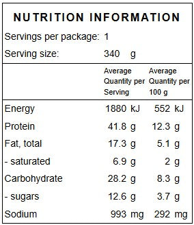 Calories: 449 | Fat: 41.8g | Carb: 28.2g | Protein 41.8g | Approx Weight: 330-340g