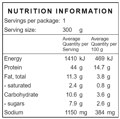Calories: 336 | Protein: 44g | Carbs: 10.6g | Fats: 11.3g | Approx weight: 300g