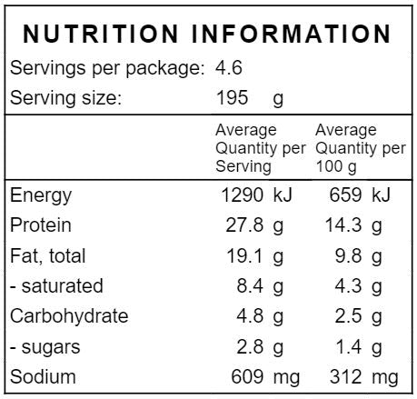 Macros per 195g serve: Calories: 308 | Protein: 27.8g | Carbs: 2.8g | Fats: 19.1g
