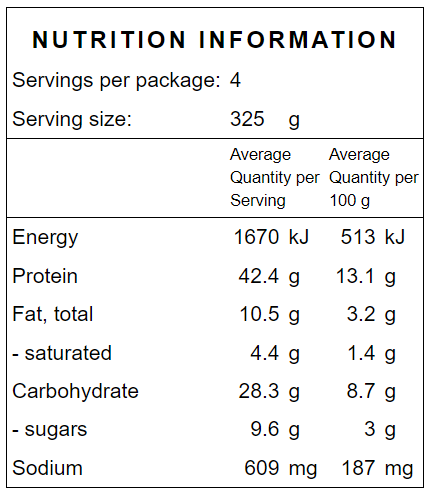 Macros per 325g serve: Calories: 399 | Protein: 42.4g | Carbs: 28.3g | Fats: 10.5g