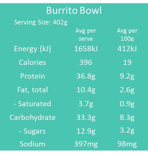 A spicy Mexican Burrito Bowl with premium beef mince cooked in our house made spice mix, kidney beans, zucchini & capsicum. Accompanied by oven roasted sweet potato, cauliflower & corn salad.