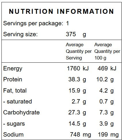 Calories: 420 | Protein: 38.3g | Fats: 15.9g | Carbs: 27.3g | Approx weight: 375g
