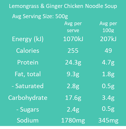 Ingredients: Chicken, lemongrass, ginger, kaffir lime leaf, tamari, garlic, chili, rice noodles, carrot noodles, chinese cabbage, shallots, coriander, fish sauce (anchovy, water, salt, sugar) & house made chicken bone broth (chicken bones, carrot, celery, onion, parsley, apple cider vinegar)