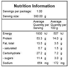 Calories: 461 | Carbs: 27.2g  | Fats: 13.5g | Protein: 53.3g  | Approx Weight: 400g