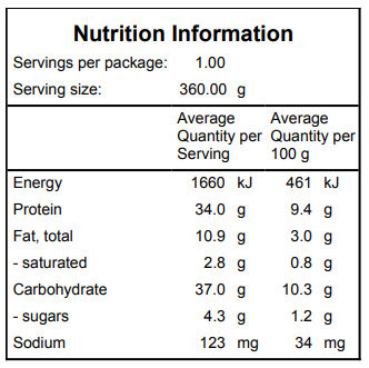 Calories: 396 | Protein: 34g | Carbs: 37g | Fat: 10.9g Approx Weight: 350-370g