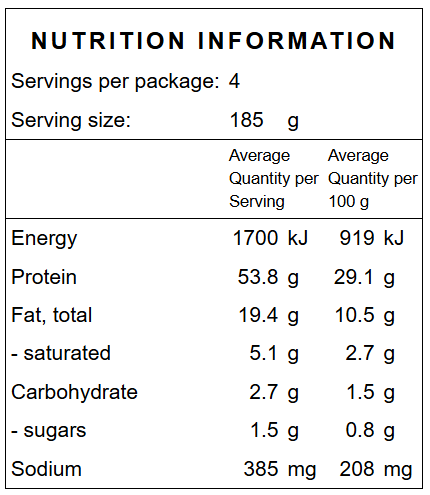 Macros per serve: Calories: 406 | Protein: 53.8g | Fat: 19.4g | Carbs: 2.7g | Cooked weight - 185g (no bones)