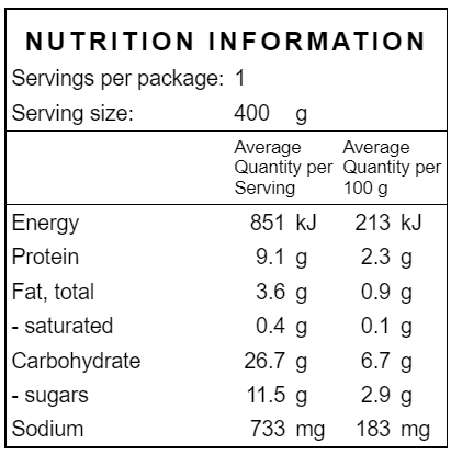 Ingredients: Lentils, chickpeas, onion, eggplant, sweet potato, carrot, house made spice mix (cumin, sweet paprika, cinnamon, chilli), garlic, coriander, lemon rind, lemon juice, tomato, olive oil, salt & pepper.
